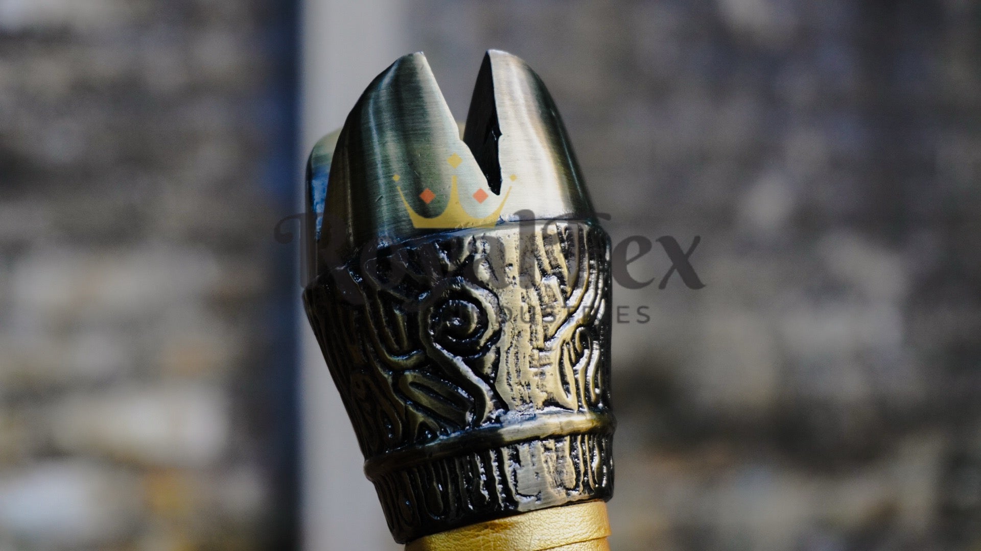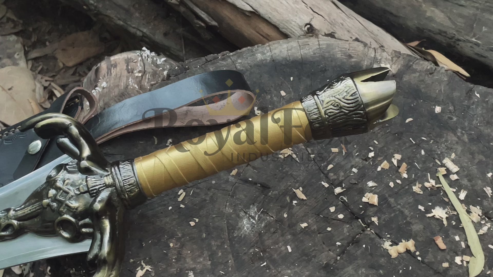 Conan Father's Sword is a large, one-handed sword with a curved blade and a intricate hilt. The hilt is made of metal and features a skull motif, as well as a pair of horns. The grip is wrapped in brown leather. The sword is made of 1095 high carbon steel and has a hardness of 52 HRC.Features:* Overall length: 40 Inches* Hand Crafted High Quality Construction* Medieval Replica Sword* Choose between Half Tang or Full Tang- no Rat tail constructionUnleash your inner barbarian with this epic replica!Crafted to embody the raw power and ferocity of the legendary Cimmerian, this Conan the Barbarian sword is a masterpiece of craftsmanship and a must-have for collectors, fantasy enthusiasts, and martial artists alike.Hand-forged from 1095 high carbon steel and tempered to a formidable 52 HRC, this 40-inch sword is not only a stunning display piece but also a testament to durability and strength.Key Features:Authentic Replica: Meticulously crafted to mirror the sword wielded by Arnold Schwarzenegger in the classic 1980s film.Uncompromising Quality: Forged by skilled artisans using traditional methods for unmatched durability and edge retention.Impressive Size: At 40 inches overall, this sword commands attention and makes a bold statement.Intricate Design: The ornate hilt and pommel are adorned with intricate details, bringing the character of Conan to life.