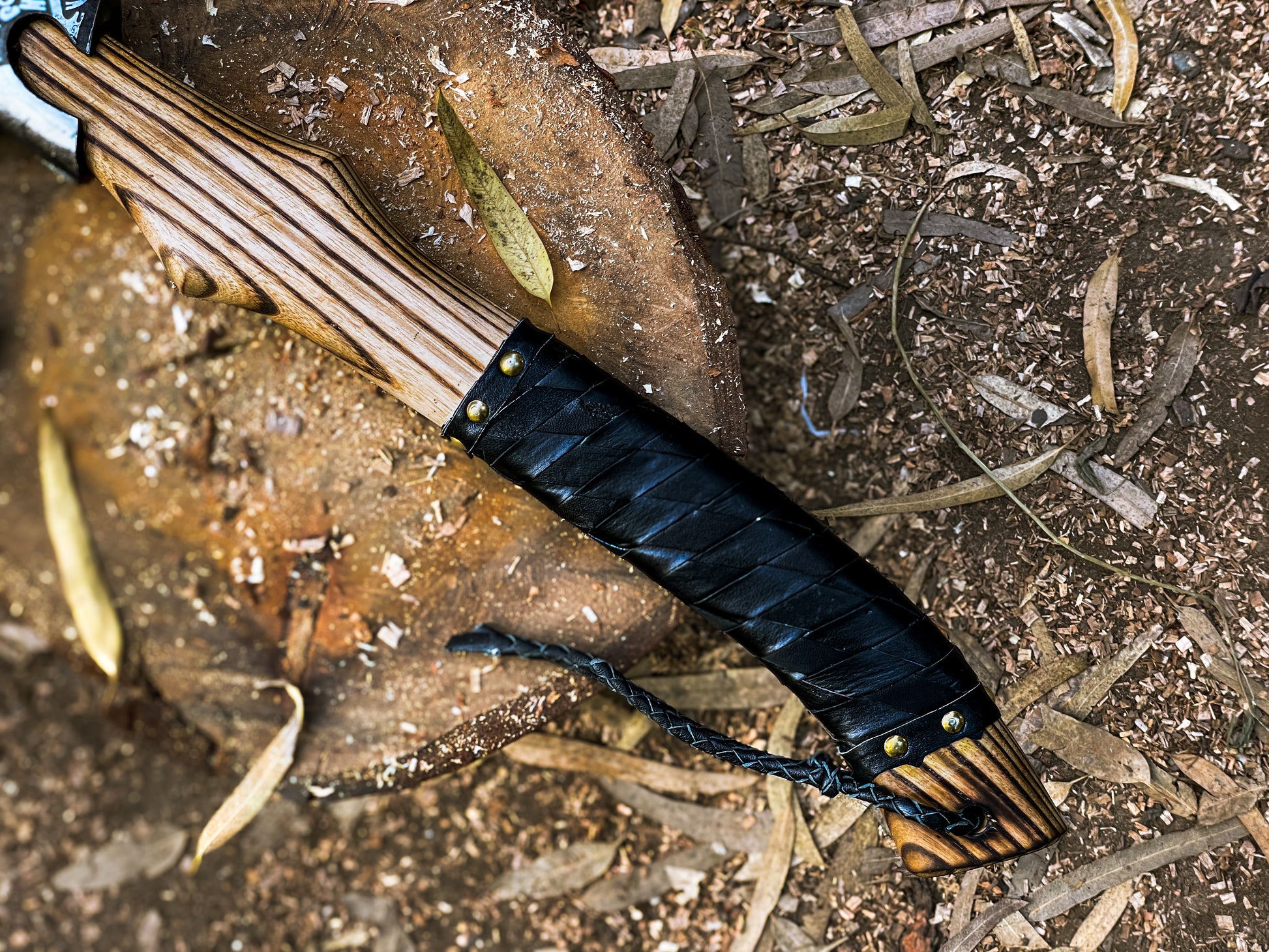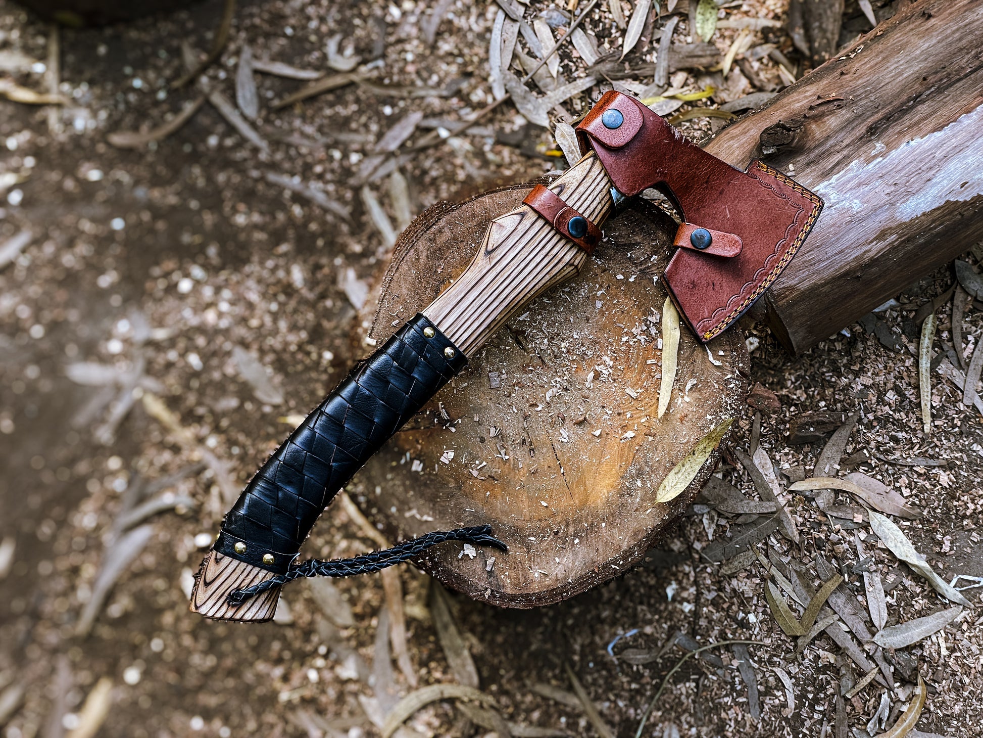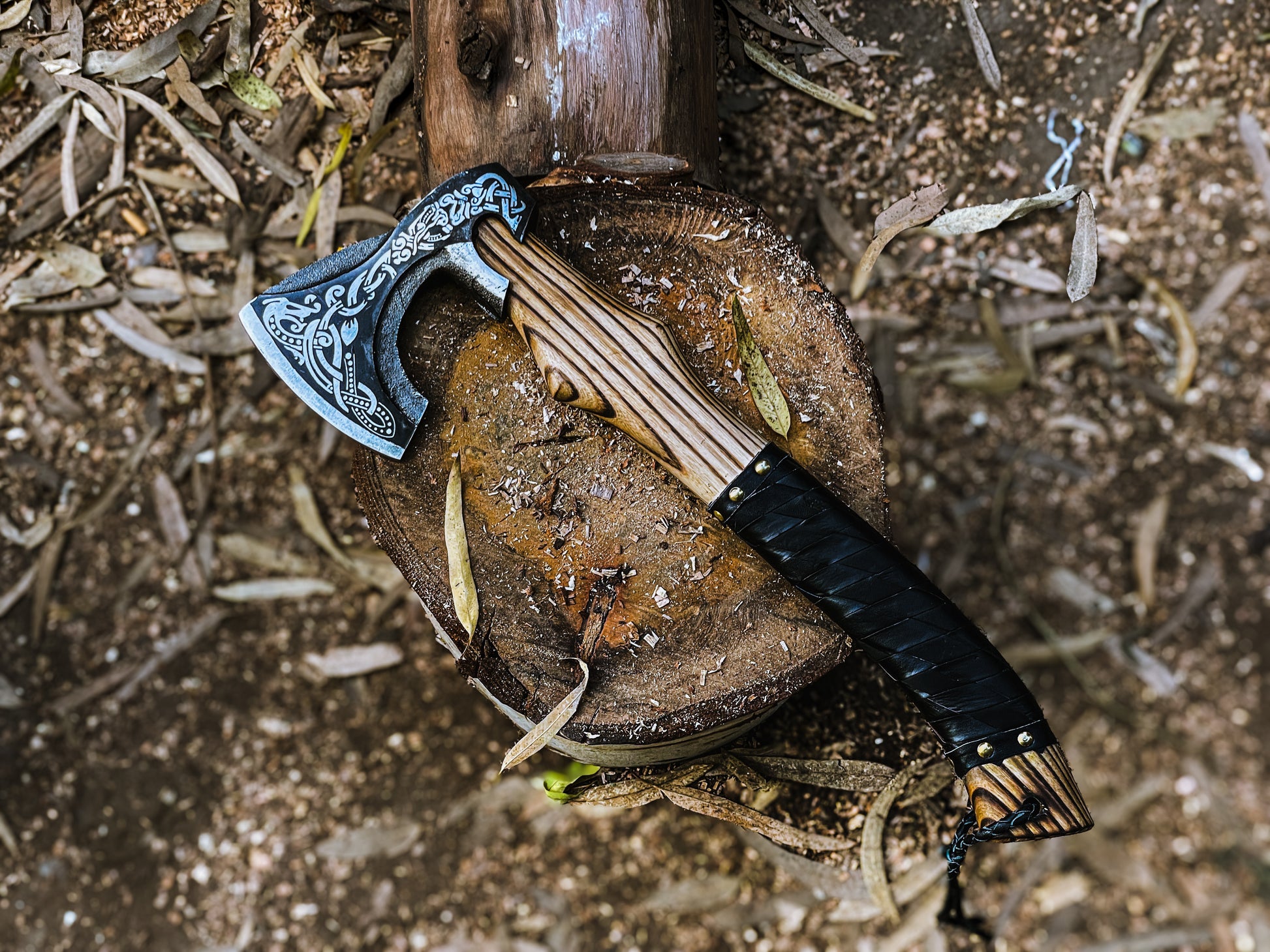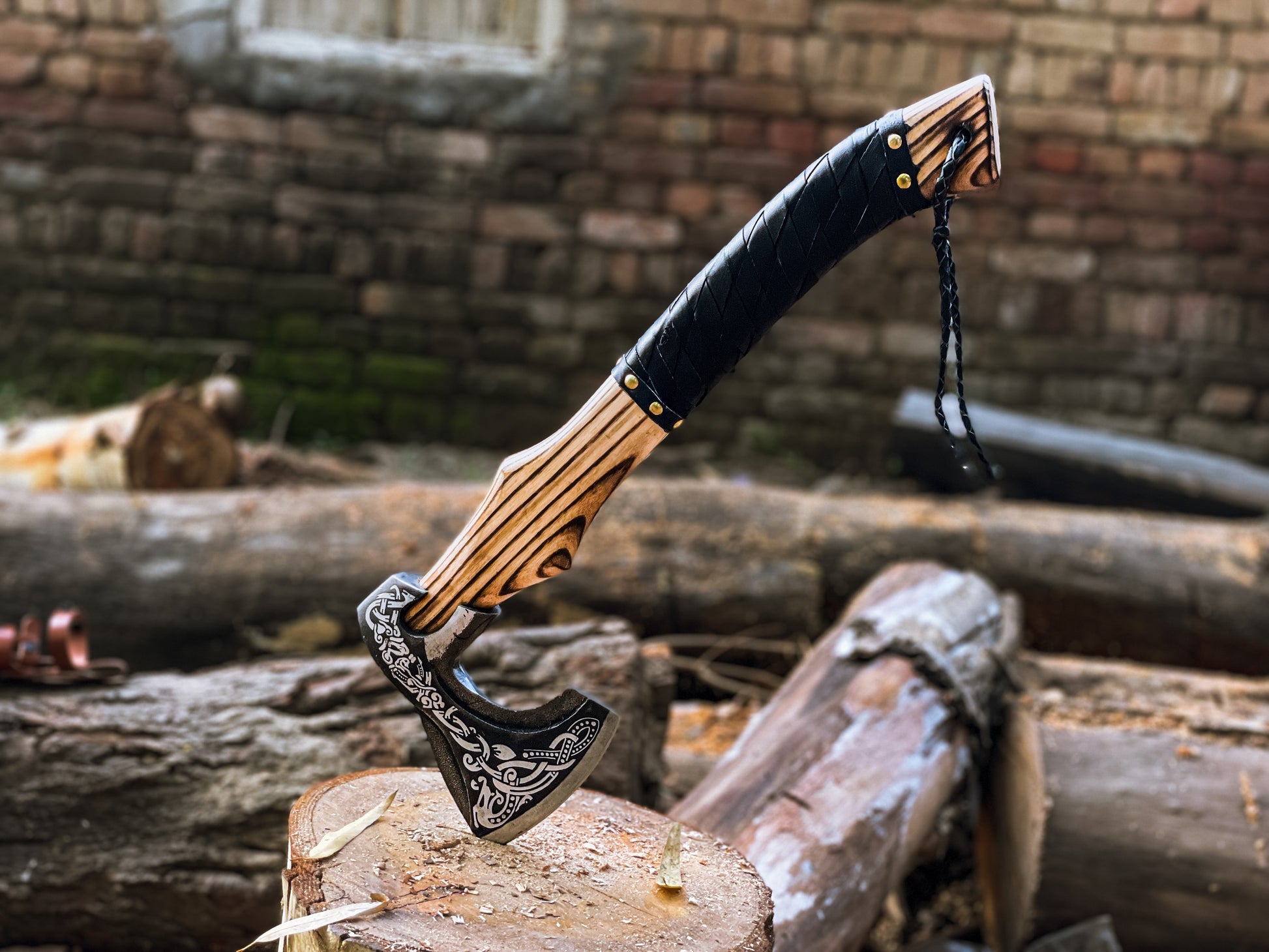 The handle is crafted from natural wood with a leather-wrapped grip, ensuring both durability and comfort. Whether you're a fan of Norse mythology, an outdoor enthusiast, or a blade collector, this custom Viking hatchet is a must-have.